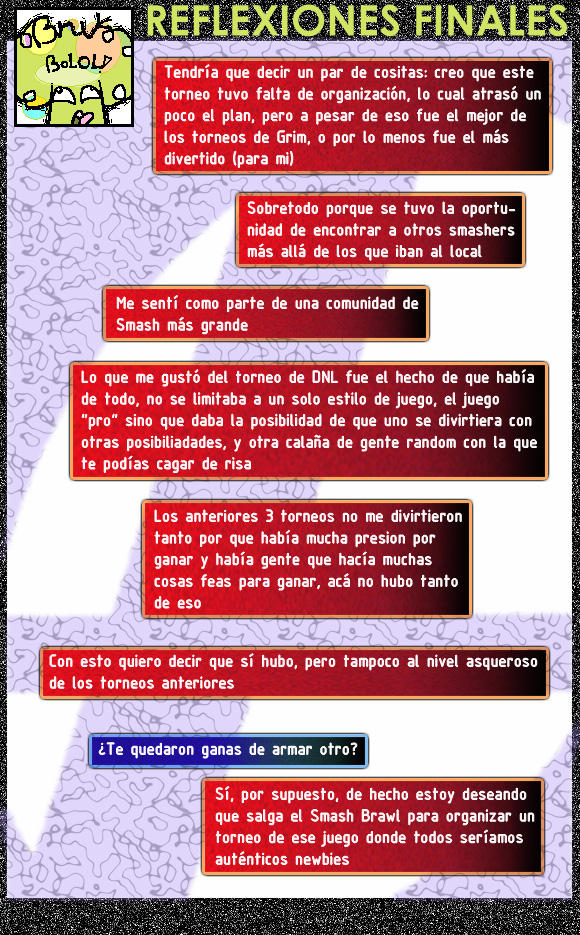 La organización y llevada a cabo, a pesar de parecer media desprolija y quizás saturante por momentos, fue un éxito. Esto, claramente, fue como lo vio (o espero que hayan visto) aquellos que participaron del evento y que comparten el fanatismo por los juegos de la saga de Smash Bros.
